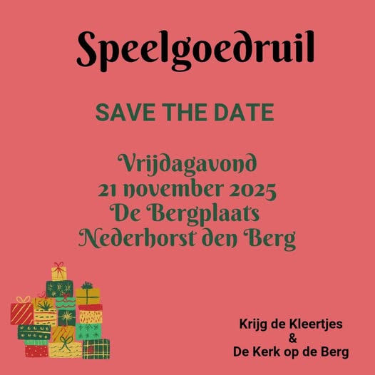 Op vrijdagavond 21 november organiseren we weer een duurzame speelgoedruil. Dit jaar doen we dat in samenwerking me de Kerk op de Berg. Zij stellen hun prachtige ruimte “De Bergplaats” beschikbaar voor de speelgoedruil, zodat we extra ruimte hebben om het speelgoed als in een echt winkeltje neer te zetten.